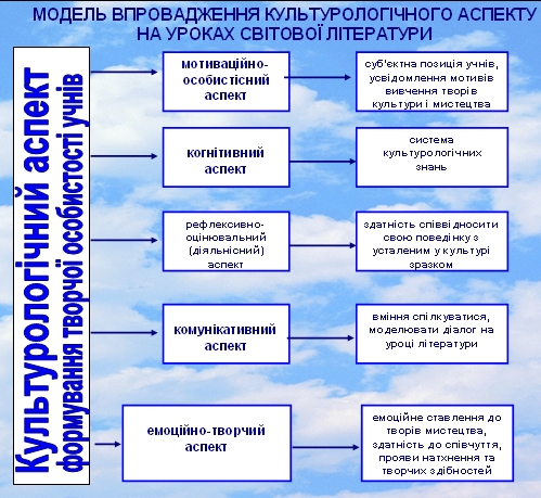 Культурологічний аспект формування творчої особистості полягає в засвоєнні школярами національного і загальнолюдського культурного простору, в залученні учнів до втілених у ньому духовних цінностей, щоб дитина, формуючись як патріот своєї країни, усвідомлювала реалії глобалізованого світу, була здатна жити і діяти в ньому, нести відповідальність за нього, бути, по суті, не тільки громадянином своєї країни, а й громадянином світу. Саме такий підхід до викладання світової літератури в школі сприяє самозбереженню і саморозвитку народу, реально забезпечуючи його майбуття.