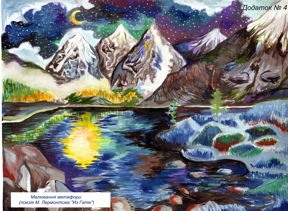 Насамперед необхідно продумати, як підготувати учнів до сприйняття художнього твору, як розпочати знайомство з ним. Цей етап має викликати інтерес у школярів, скерувати їх на сприйняття авторської думки, створити атмосферу емоційного співпереживання, налаштувати на певну тональність, підготувати учнів до духовної діяльності під час читання літературного твору. Для вирішення подібних завдань я використовую асоціативні вправи із залученням творів інших видів мистецтв (додаток № 3). Це може бути поглиблення уявлень про загальну картину доби за допомогою творів живопису або музики, розгляд літературних ремінісценцій у мистецтві, звертання до портретів письменників, виконаних видатними художниками, і навпаки, до картин, написаних майстрами слова, зіставлення творів різних видів мистецтва, близьких за тематикою і мотивами. Наприклад, при обговоренні концепції творчості у романі М.Булгакова «Майстер і Маргарита» я пропоную учням прослухати уривки з грандіозного твору І.С.Баха «Притрасті за Матвієм», і в музичному виконанні історія життя, страждань і мук Іісуса Христа здається пронизливо близькою, зрозумілою і незмірно високою. Так музичний твір стає для учнів глибинним підтекстом роману. Дуже плідним при вивченні повісті М. Гоголя «Тарас Бульба» як правило буває звертання до живописного полотна І. Рєпіна «Запоріжці пишуть листа турецькому султану». У молодших класах надзвичайно ефективним, на мою думку, є прийом малювання метафор (додаток № 4). Прикладів таких безкінечно багато. Слід зазначити, що асоціативні вправи можна з успіхом використовувати на будь-яких етапах уроку (запропонувати учням зіставити художні полотна, музичні твори, поетичні рядки з певними напрямками в літературі тощо).
