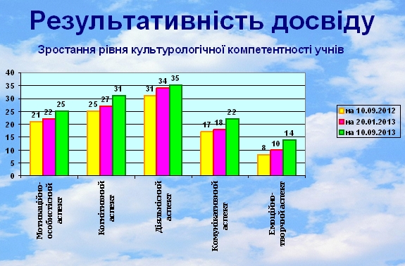 Згідно з моделью впровадження культурологічного підходу на уроках світової літератури (додаток № 1), я разом зі шкільним психологом протягом року вивчала мотиваційно-особистісний, когнітивний, рефлексивно-оцінювальний, комунікативний та емоційно-творчий аспекти формування культурологічної компетентності школярів. Для вивчення мотиваційно-особистісного аспекту була застосована методика вивчення внутрішньої мотивації до навчання (ОНУМ), для оцінювання когнітивного аспекту були використані показники якості знань учнів зі світової літератури, діяльнісний аспект як здатність дітей співвідносити свою поведінку з усталеним у культурі зразком вивчався за методикою визначення ціннісних орієнтацій М. Рокича, комунікативний аспект розглядався як уміння вести діалог на уроці літератури, а емоційно-творчий аспект оцінювався за кількістю учнів, які брали участь у різноманітних творчих конкурсах і проектах, в олімпіадах зі світової літератури, російської мови, а також у конкурсі-захисті наукових робіт в МАН. Головним показником ефективності впровадження досвіду є зростання рівня культурологічної компетентності учнів на 9,1 % (додаток № 5).